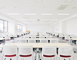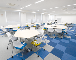 学生ラウンジナチュラルなホワイトのテーブルとオレンジ色の椅子を配置し、学生が寛いで過ごせる空間です。コピー機などの設備を用意し、予習・復習等の自習の場にもなります。