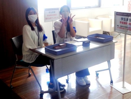エントランスホールでは、学生スタッフが参加者をお迎えし、大学案内・学生募集要項、参加者限定のオリジナルグッズ等を配付しました。