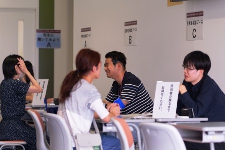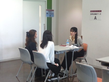 写真は学生生活の相談ブースで、学生スタッフが相談を受けている様子です。