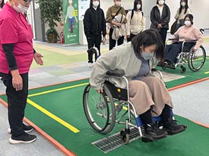 住宅の床材、扉の構造のほか、車いすや介助用品などが様々に展示されており、実際に使用体験もさせていただきました。