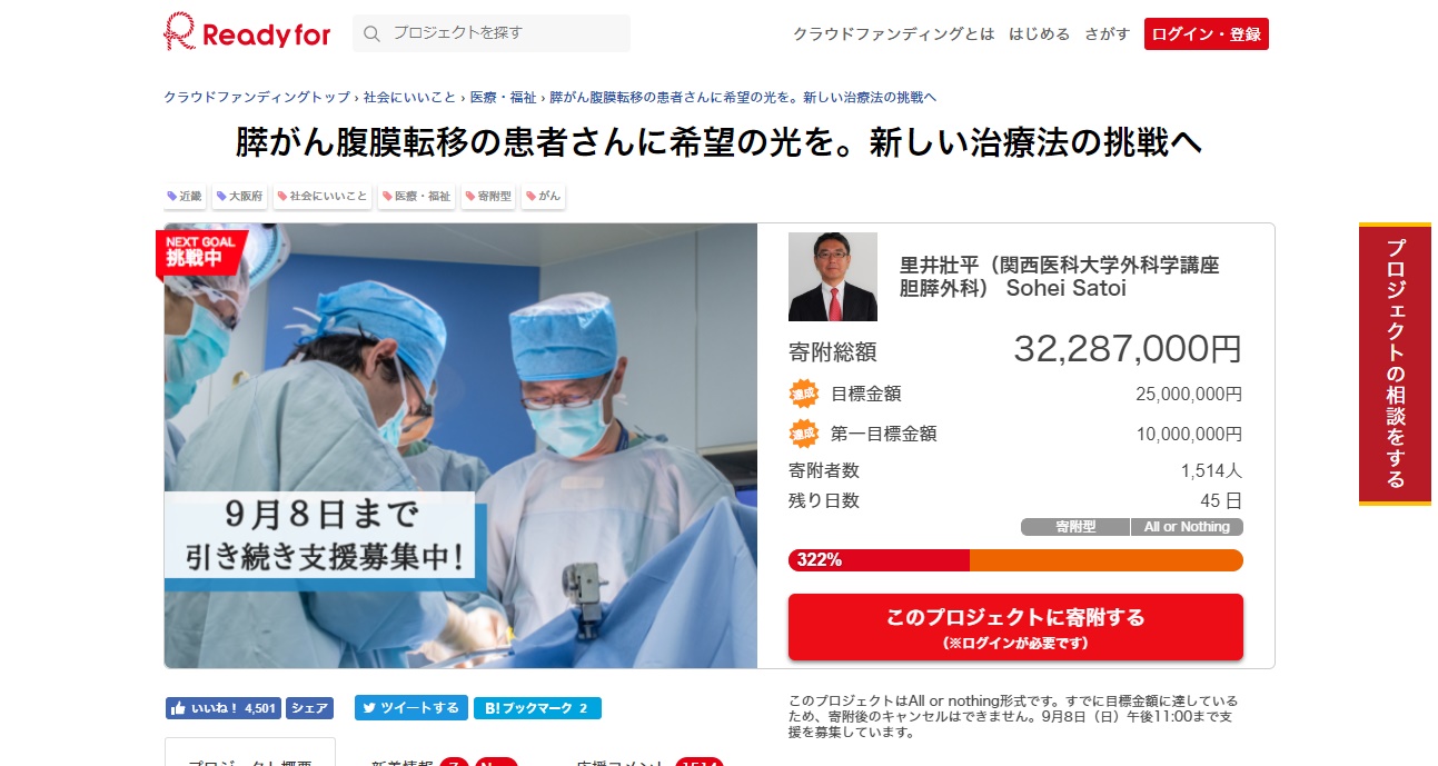 そこで注目したのがクラウドファンディング。広く社会から寄附を集め、その資金で臨床試験(医師主導治験)を実施する。そして成果を検証し、まとめ、一日でも早く保健収載を実現することで、一人でも多くの腹膜転移膵がん患者さんを救うことができるかも知れない。里井診療教授はそう考え、公的研究費でも企業の支援でもない、本学でも初めてとなる新たな資金調達に挑戦することを決断しました。
