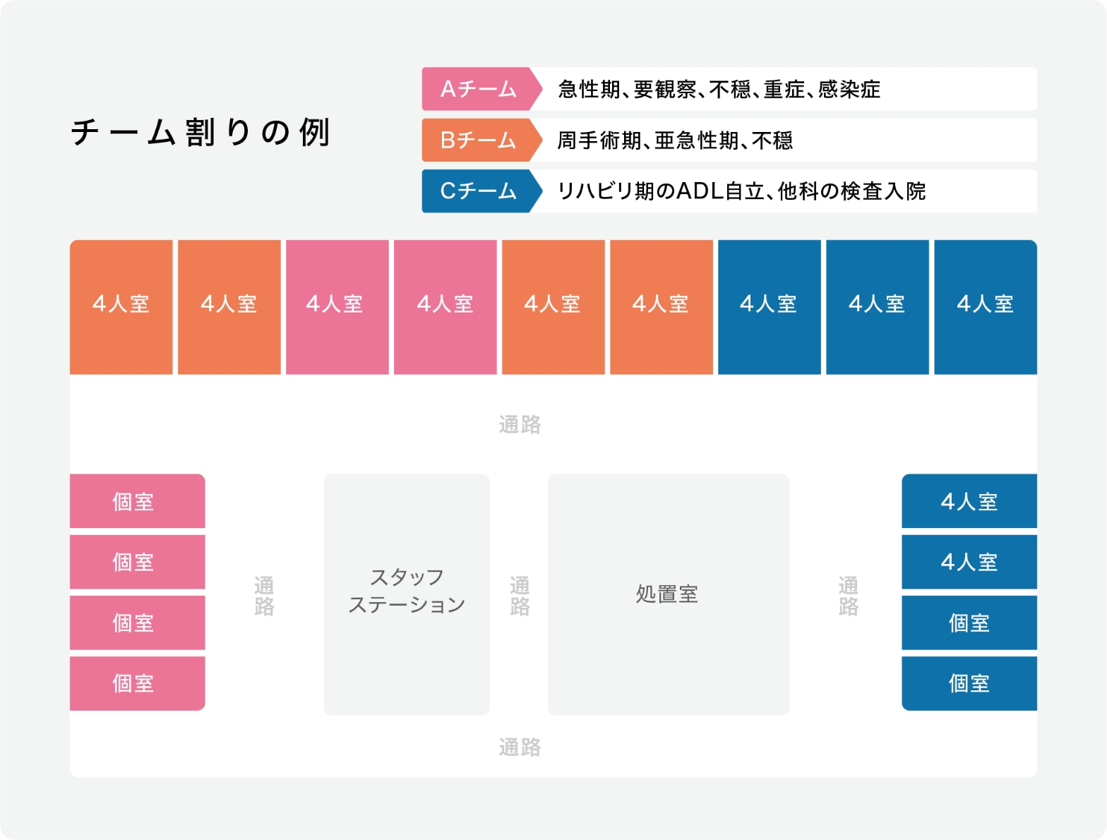 基本的には同じチームで患者様を受け持ちますが、症状により患者様が部屋を移動した場合は、受け持ちチームも交代します。