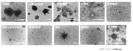 KMUバイオバンクに保存されたPDOの例。これまでに200検体以上のPDOが凍結保存されています。保存されているPDOの種類は大腸癌、十二指腸乳頭部癌、胆管癌、腎癌、膀胱癌、副腎腫瘍、前立腺癌、膵癌、舌癌、食道癌、胃癌などになります。
