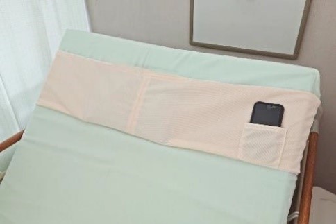 発熱時などに入院患者が使用する冷却材を簡単に、かつ適切な位置に固定できる製品。ベッドを起こした際にずれ落ちたり床に落下しがちだった冷却材を保持し続けることができ、スマートフォンを入れておけるポケットもついていて、入院生活中のちょっとした不便を解消できる製品です。
