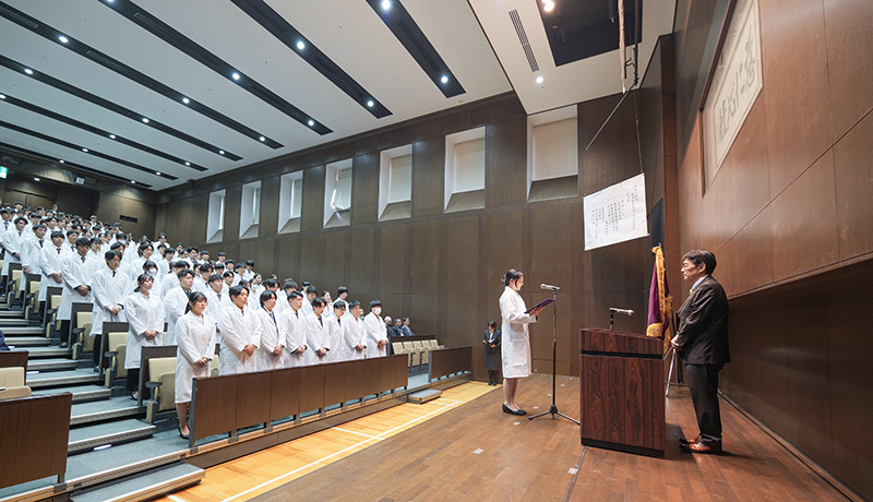 医学部金子一成学部長・副学長、同教務部岡田英孝部長・副学長の挨拶に続き、実習先となる附属病院の谷川昇副病院長、総合医療センターの杉浦哲朗病院長から訓辞が行われ、学生たち一人ひとりに慈仁会から寄贈された白衣が授与されました。